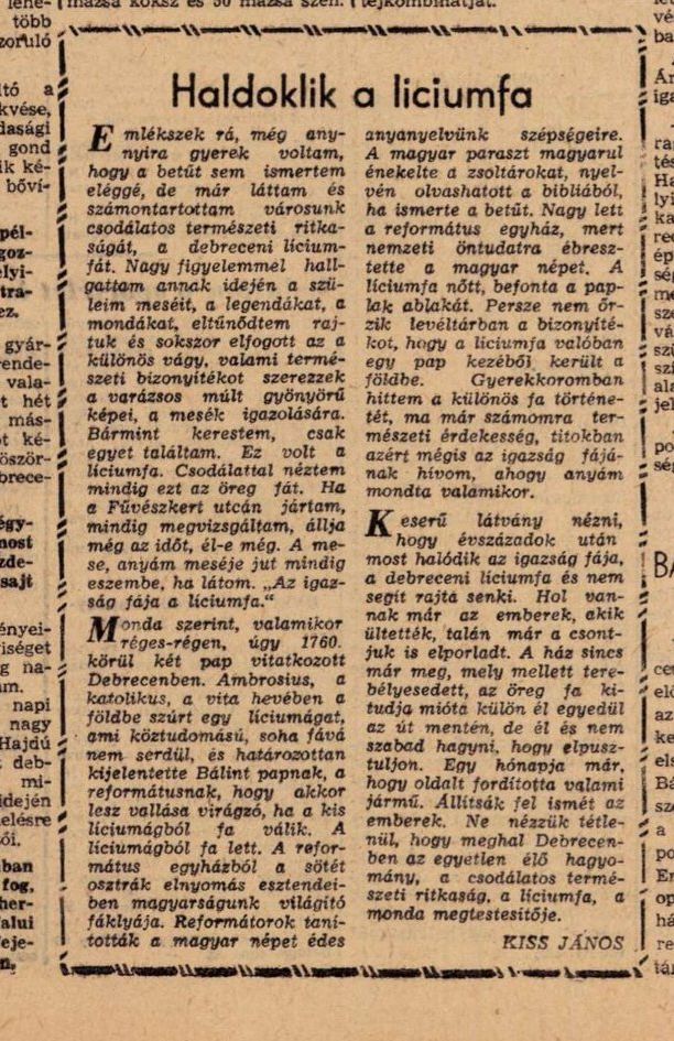 Ezzel a címmel jelent meg egy írás 1956 decemberében, alig egy hónappal a forradalom leverése után az akkori Hajdú-Bihari Naplóban, Kiss János tollából. Mint a szerző anno írja: „Keserű látvány nézni, hogy évszázadok után most halódik az igazság fája…”